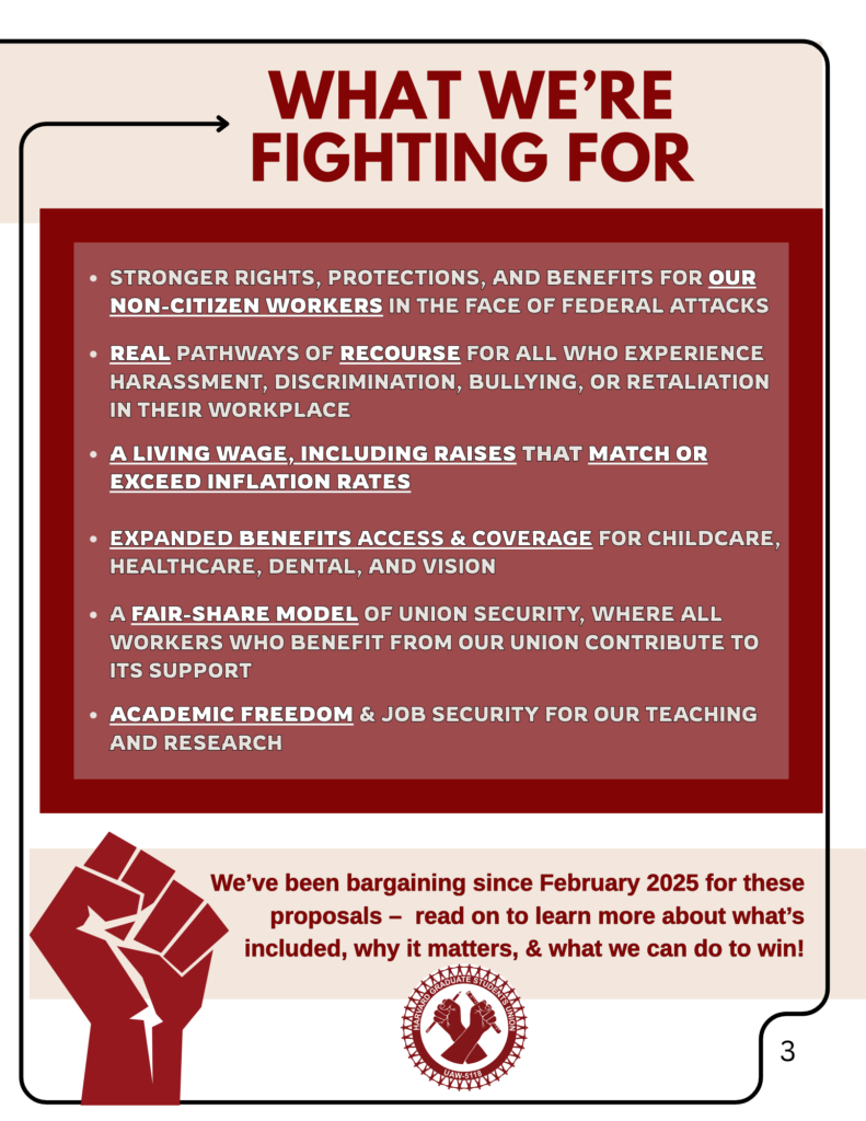 We have been bargaining with University administration since February 2025 on our key issues of; pay equity; real recourse against harassment and discrimination; stronger non-citizen worker protections; and fair share fees that ensure we can enforce our contract.