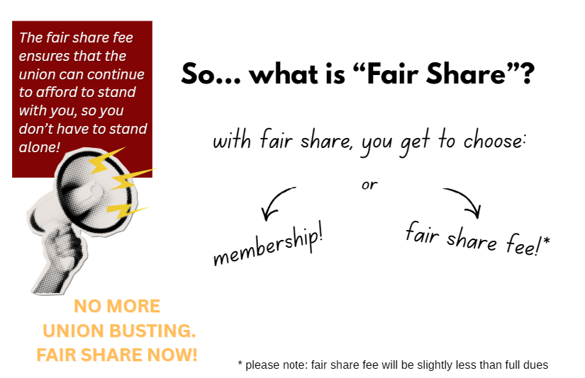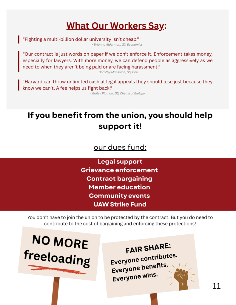 So far, only members have funded this union—but everyone (yes, that means non-members) gets contract protections. We are asking for what’s called a “fair share fee” to ensure that the Union has adequate resources to defend all our workers’ rights. Without financial stability, we can’t enforce the contract or fight back when Harvard breaks the rules. Arbitration to get someone their missing pay or protect against harassment can cost over $10,000.