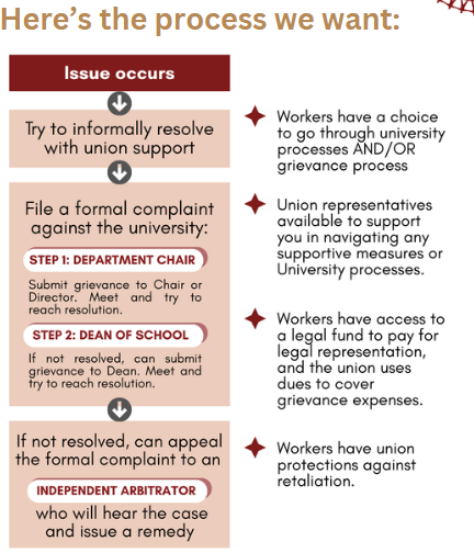 We are demanding changes that better allow Union representatives to support you in navigating departmental, University-level, and independent arbitration processes. This is standard across other student worker contracts at Universities around the country, and for other Unions at Harvard, and we deserve to be on par with our peers!